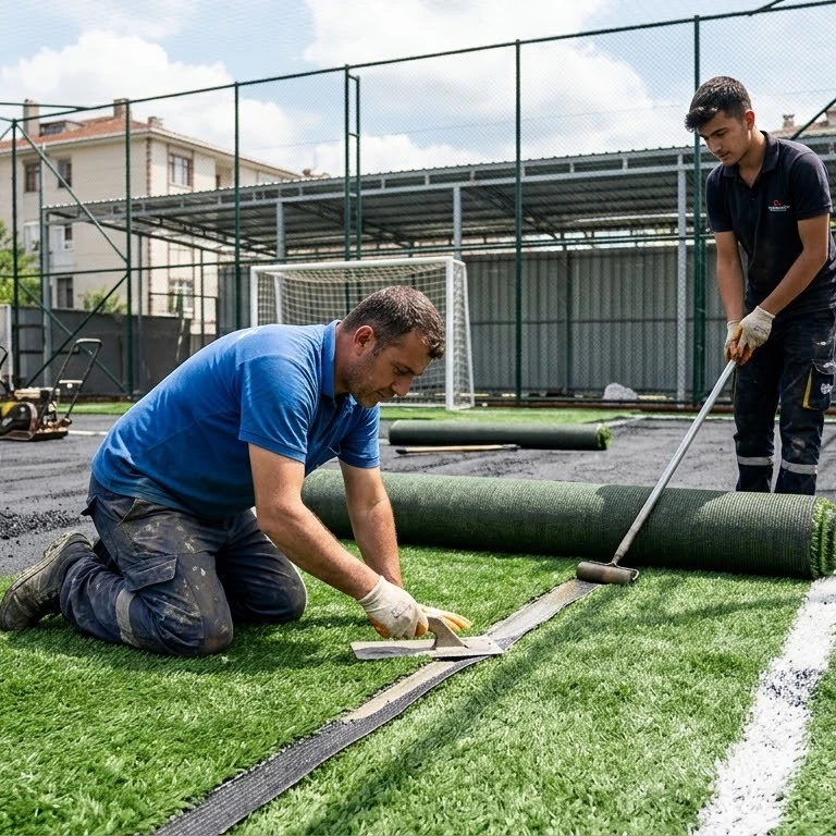 Zemin hazırlandıktan sonra, keçe serimi yapılır ve üzerine rulo halindeki sentetik çimler açılır. Suni çim saha yapımı esnasında en kritik noktalardan biri, halıların ek yerlerinin (seaming tape) çift bileşenli özel yapıştırıcılar ile kusursuz bir şekilde birleştirilmesidir. Çizgilerin orijinal beyaz iplikten dokunmuş olması veya sonradan kesilerek yerleştirilmesi de sahanın profesyonelliğini gösterir. Son aşamada ise silis kumu ve granül dolgusu yapılarak saha oyun oynamaya hazır hale getirilir.